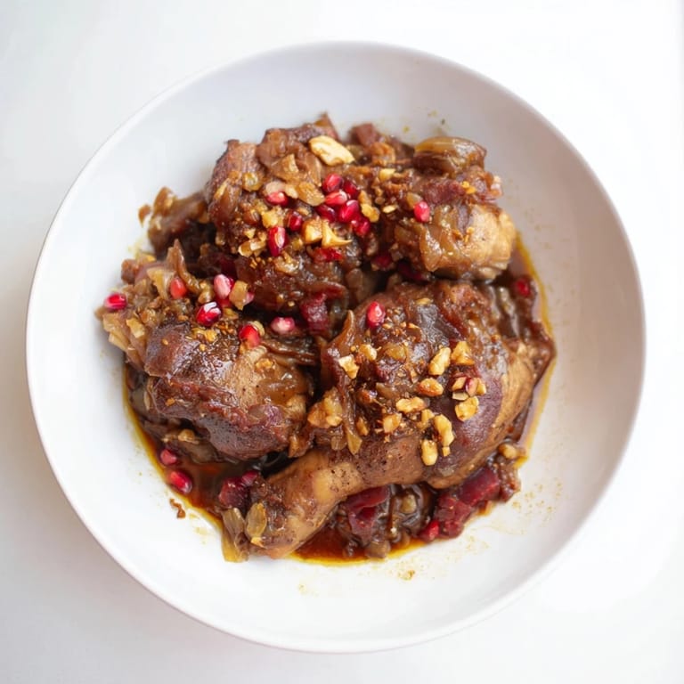 Save A rich, tangy-sweet Persian stew featuring tender chicken thighs simmered with walnuts and pomegranate molasses, offering classic flavors on a budget.