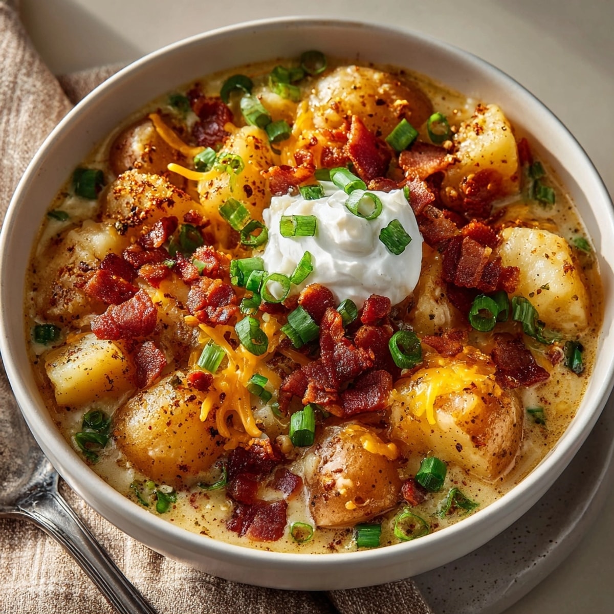 Save This hearty loaded baked potato chowder transforms the classic comfort food into a spoonable delight. The creamy base cradles tender potato chunks and crispy bacon pieces, creating a bowl that tastes just like your favorite loaded baked potato—but even more comforting.