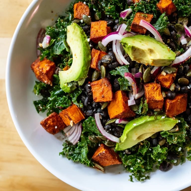 Save A vibrant, nutrient-packed salad featuring tender kale, roasted sweet potato, hearty black beans, and a zesty lime dressing. Perfect as a light lunch or a flavorful side.