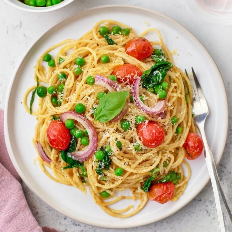 This spaghetti is hearty enough to stand alone, but I love serving it with a simple arugula salad dressed in lemon and olive oil, or a slice of crusty bread to mop up any remaining broth at the bottom of the bowl. If you want to make it feel more like a dinner party, pour a crisp Sauvignon Blanc or a light Pinot Grigio, something that echoes the brightness of the lemon and complements the sweetness of the peas and tomatoes. I've also served it with a side of roasted garlic bread, which is probably overkill but nobody has ever complained.