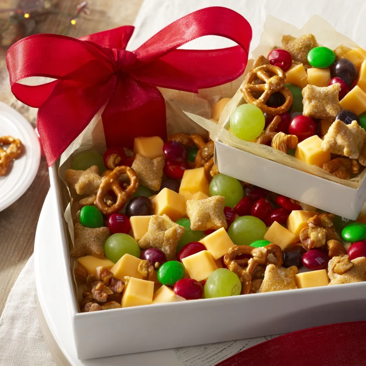 Ensure each box is securely stacked for stability and consider using non-slip pads if needed. Lining boxes with parchment paper helps keep snacks fresh and prevents oils or moisture from seeping through. Choose bright, festive ribbons to enhance the holiday look.