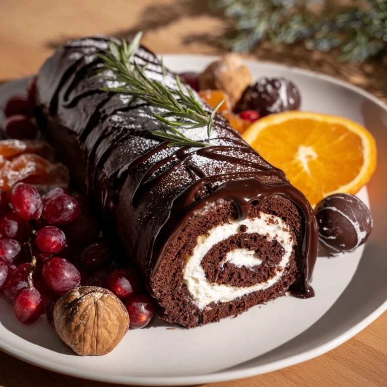 Save A cozy, festive dessert board inspired by a yule log and winter treats, featuring a rich chocolate roulade, assorted seasonal accompaniments, and warming flavors perfect for sharing around the fireplace.