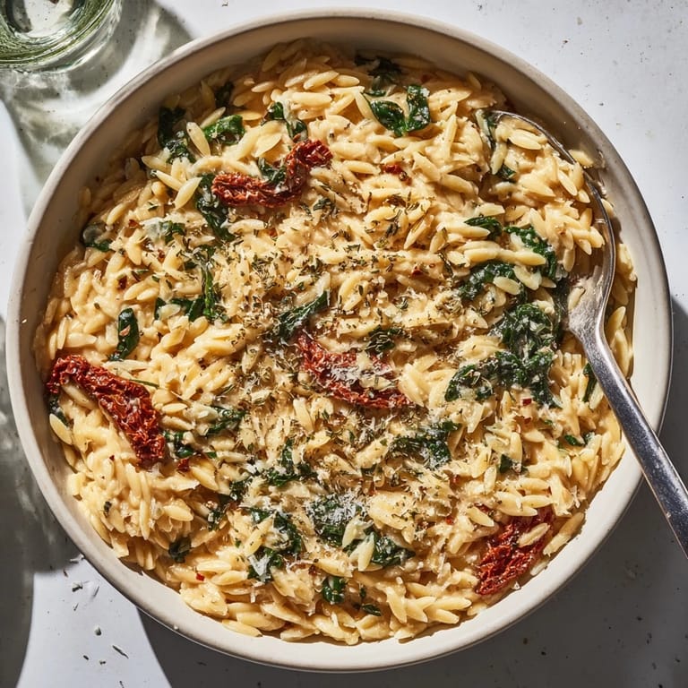 Save A rich and comforting bowl of orzo pasta, simmered in a creamy garlic-Parmesan sauce with sun-dried tomatoes, spinach, and a hint of Italian herbs. Perfect for a satisfying vegetarian meal.