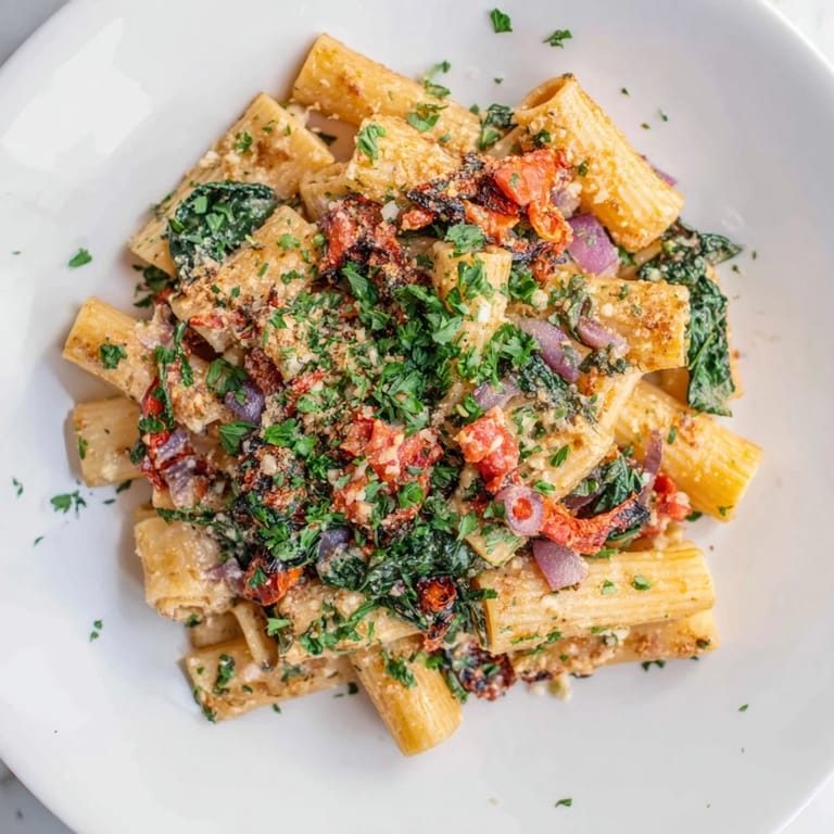 Save A vibrant, oven-baked pasta packed with Mediterranean flavors, featuring roasted garlic, fresh herbs, sun-dried tomatoes, and creamy feta. A comforting vegetarian dish perfect for weeknights or entertaining.