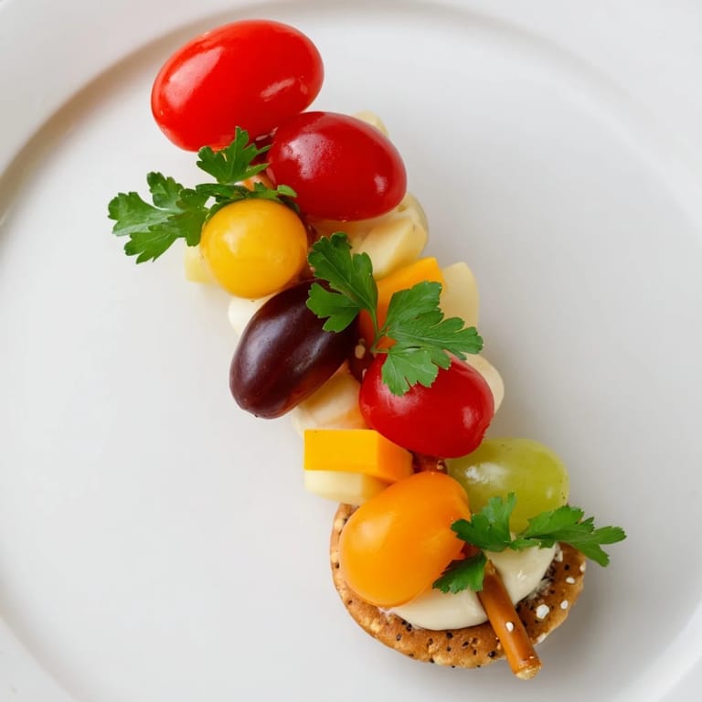 - Fresh Produce: 1 pint cherry tomatoes (assorted colors), 1 cup seedless grapes (red, green, or mixed), 1 cup cubed cheddar cheese, 1 cup mini mozzarella balls